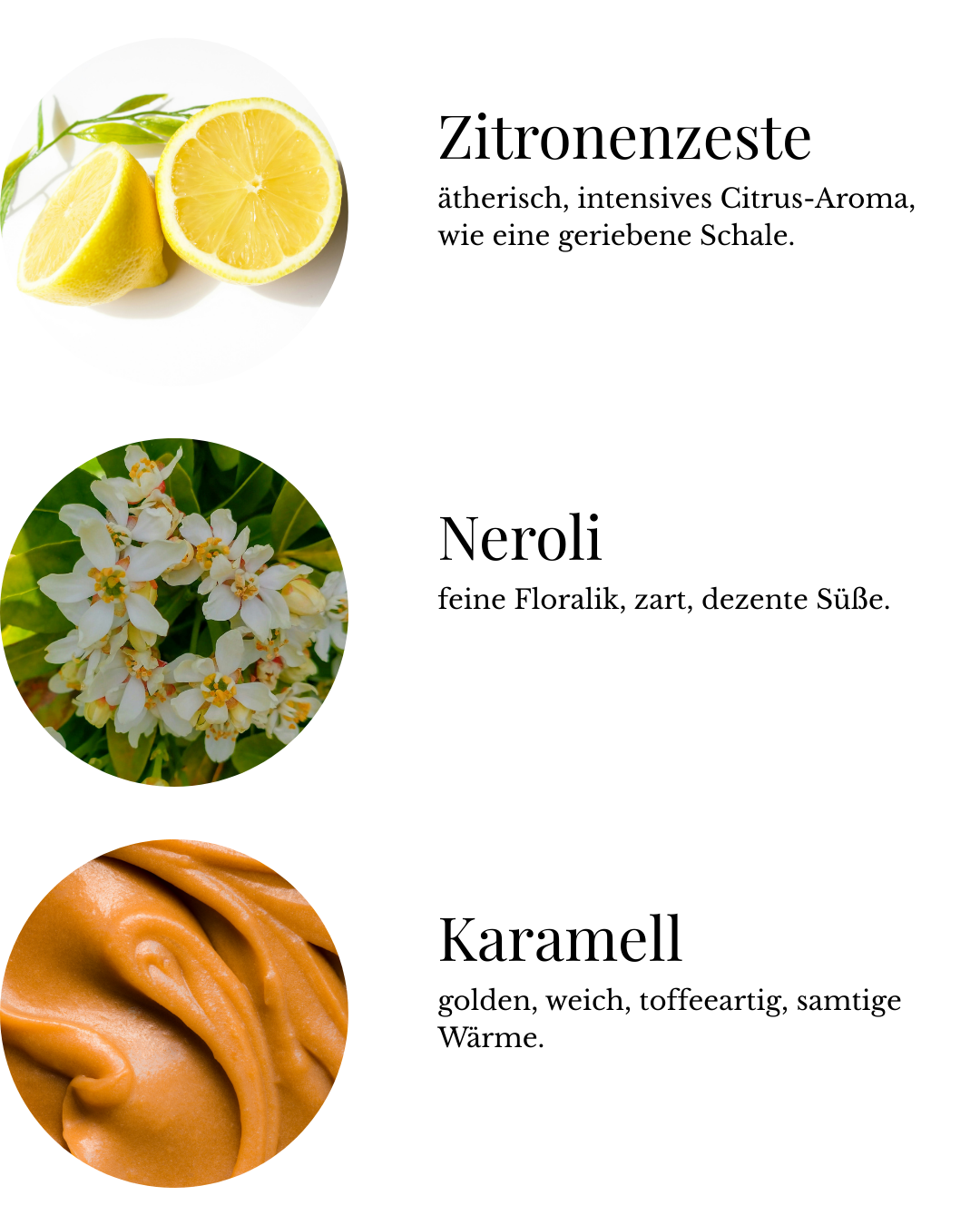 Ein klarer, intensiver Zitrusimpuls trifft auf sanfte florale Milde, darunter entfaltet sich eine goldene Karamellwärme – weich und beruhigend. Hell im Auftakt, cremig im Kern, warm im Ausklang – ein edler Cozy-Moment, wie sanfte Sonnenstrahlen, die alles in Gold tauchen.