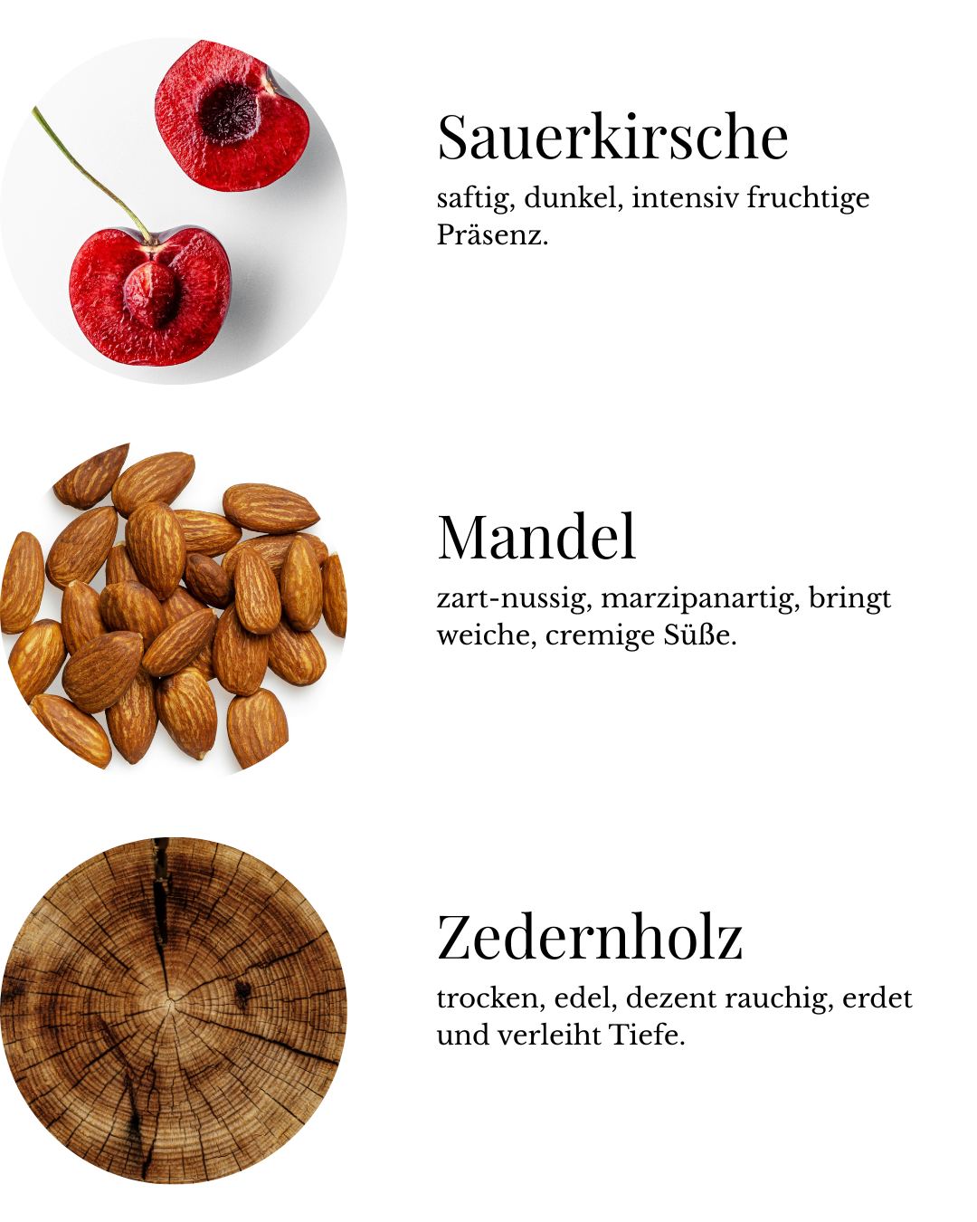 Reife Sauerkirsche eröffnet tiefrot und präzise, eine weiche Mandelcreme nimmt die Kanten und rundet die Süße ab, fein trockenes Zedernholz gibt Struktur und stille Wärme. Intensives Kirschenaroma – dunkelrot, mit edlem Nachhall. Wie die letzten Sonnenstrahlen eines Spätsommertages.