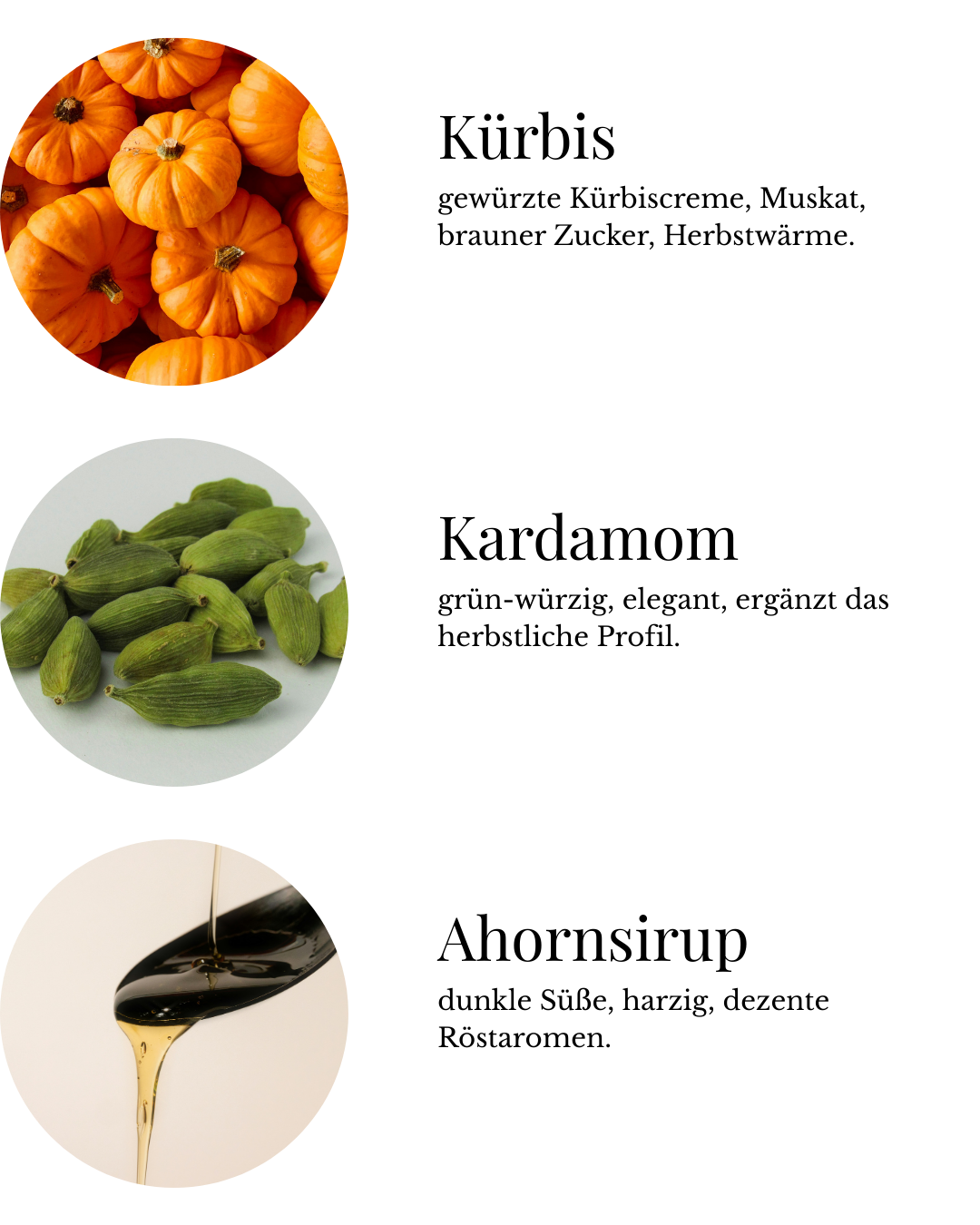 Gewürzter Kürbis; grüner Kardamom setzt eine klare, elegante Spannung; ein tiefer Ahornschmelz legt milde, geröstete Wärme darunter. Cozy Pumpkin Spice vibes – wie ein ruhiger Herbstspaziergang über orange-braune Blätter.