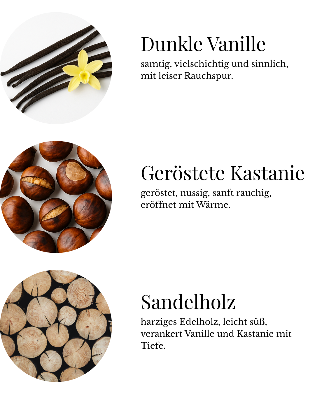 Dunkle Vanille | Geröstete Kastanie | Sandelholz